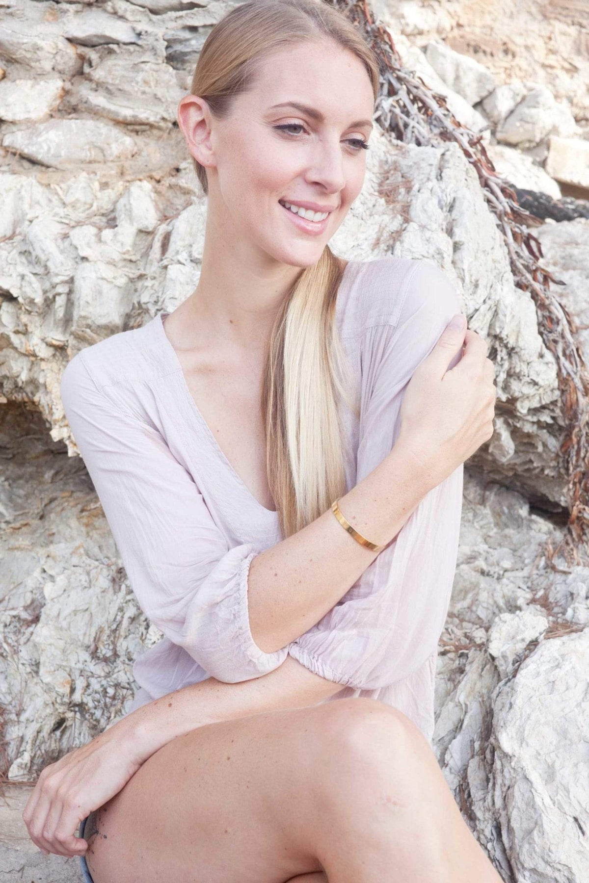 Weibliches Model mit gold glänzendem Armreif vor Steinmauer