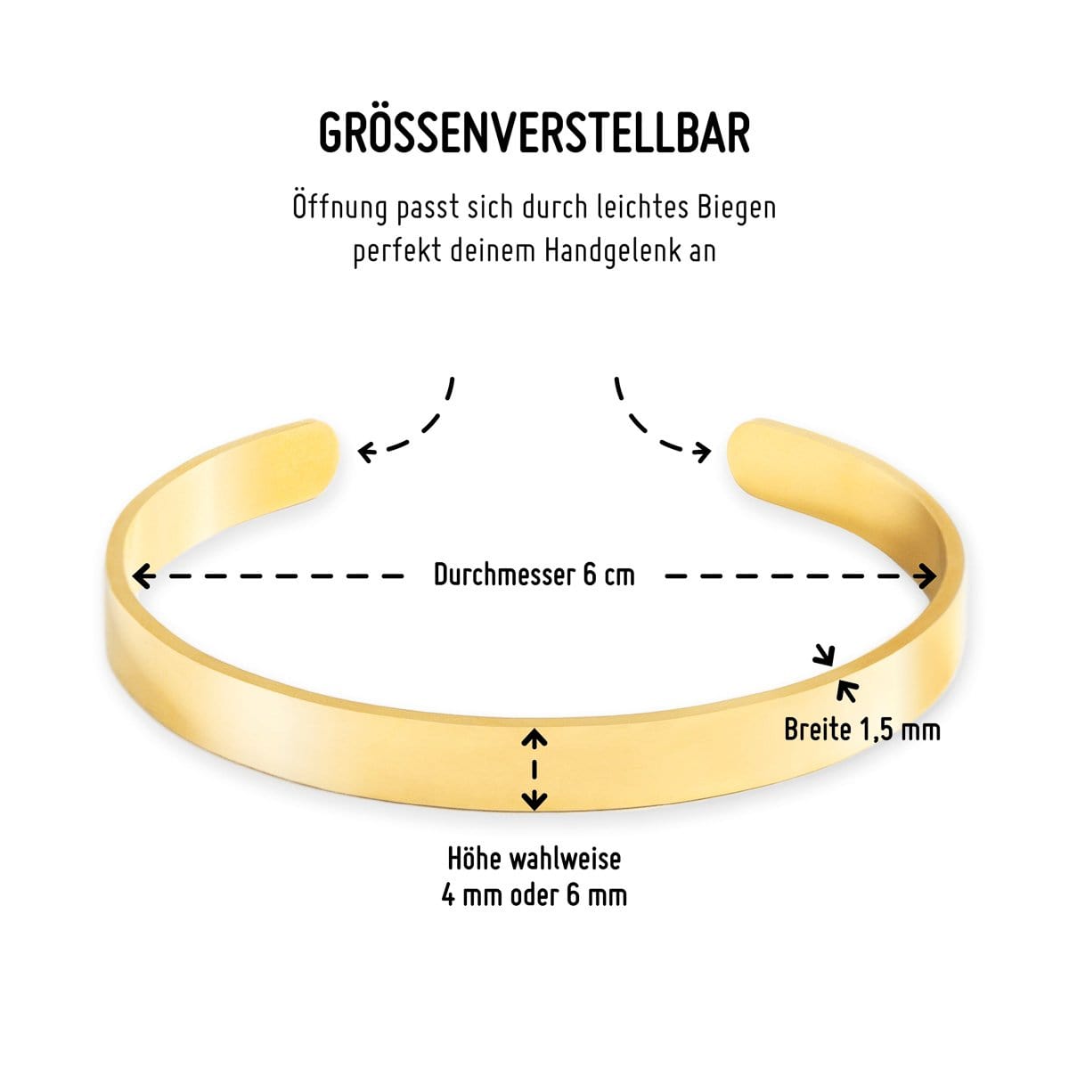 Jedes Exemplar wird in unserem Berliner Studio im Diamantgravur-Verfahren handgefertigt. Unser Schmuck mit Gravur: Bei der Gestaltung sind deinen Ideen keine Grenzen gesetzt – egal ob Name, Geburtsdatum oder Lebensmotto. Pro Seite können wir bis zu 32 Zeichen gravieren. Der Gravur Armreif hat einen Umfang von 18 cm (inkl. Öffnung), einen Durchmesser von 6 cm und 6 mm breit. Durch seine größenverstellbare Öffnung (+-1,5 cm) passt er sich perfekt deinem Handgelenk oder dem der Beschenkten an.