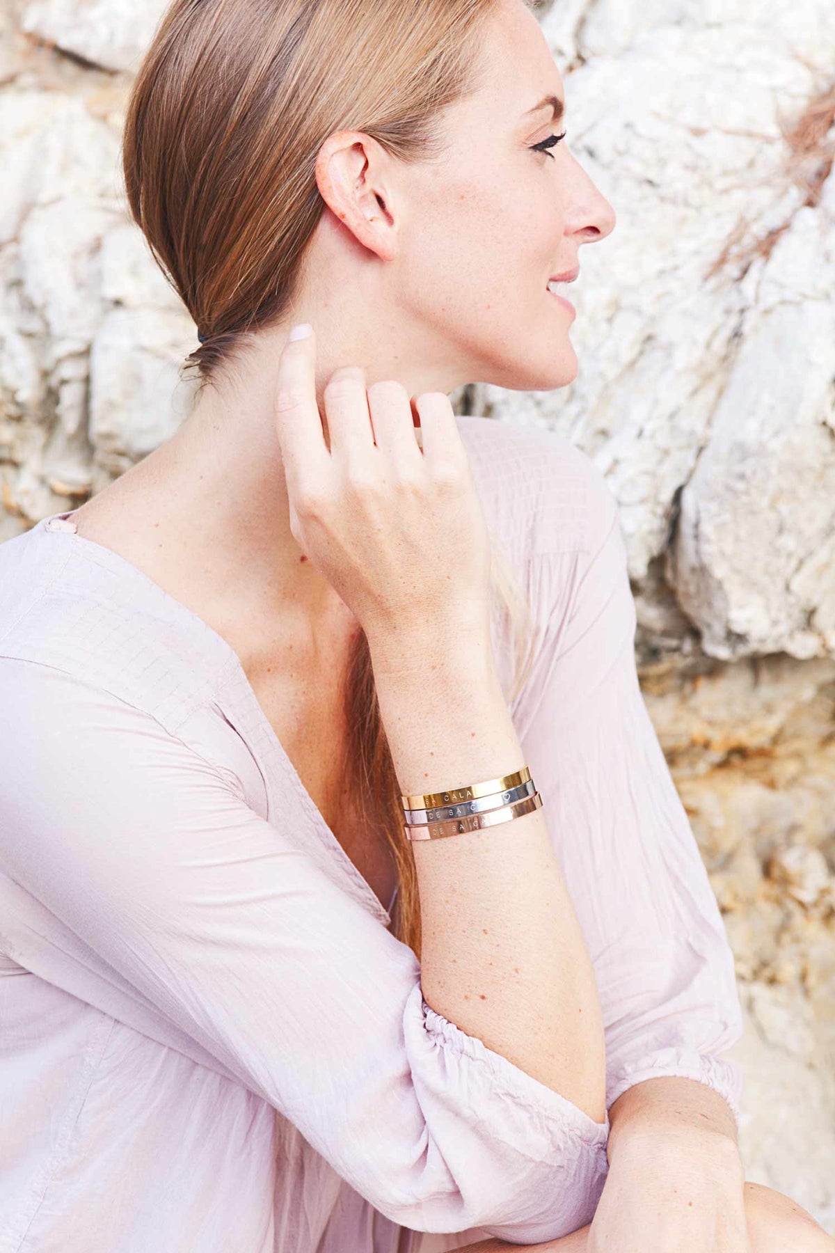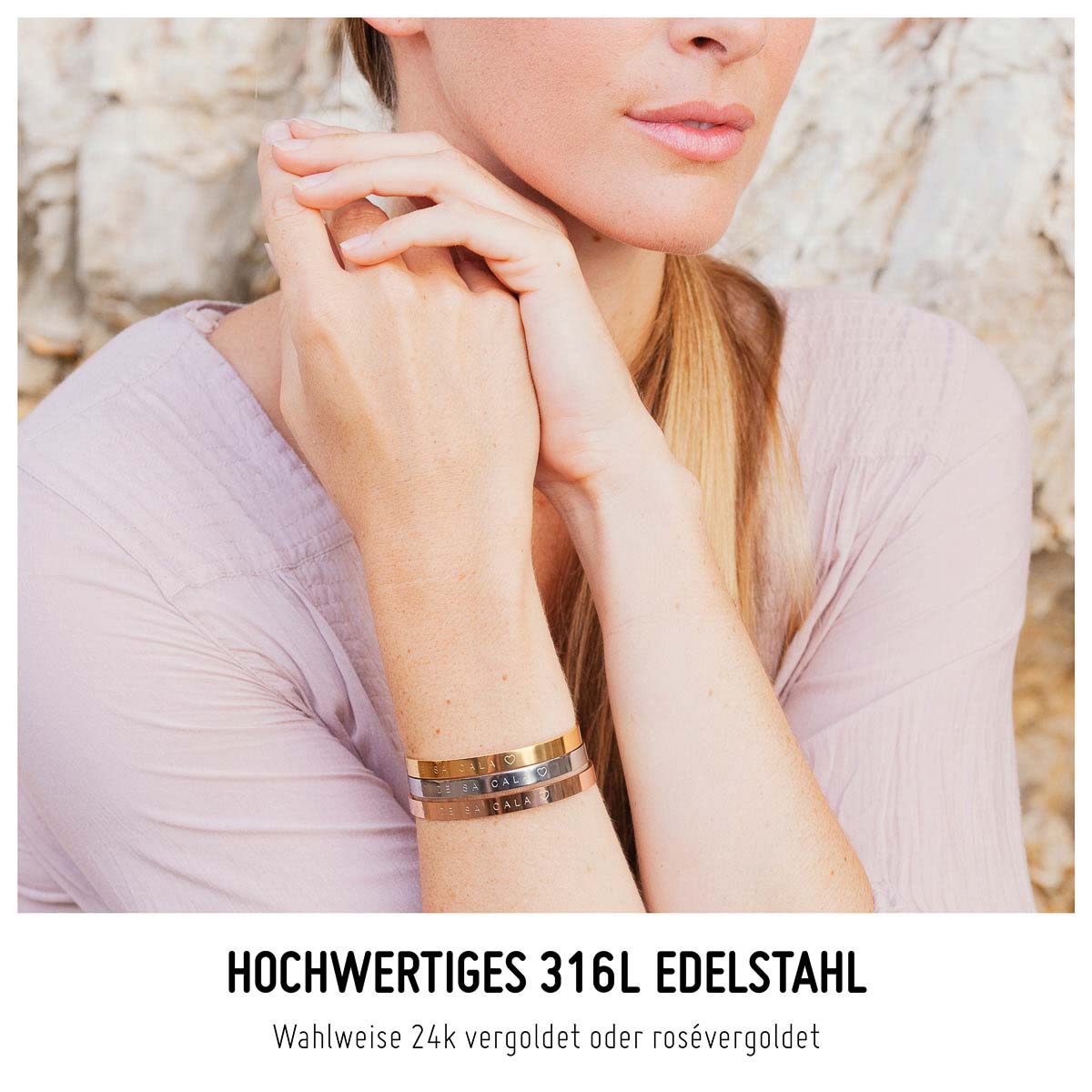 Model präsentiert personalisierte Schmuck Armbänder aus Edelstahl vor Steinmauer